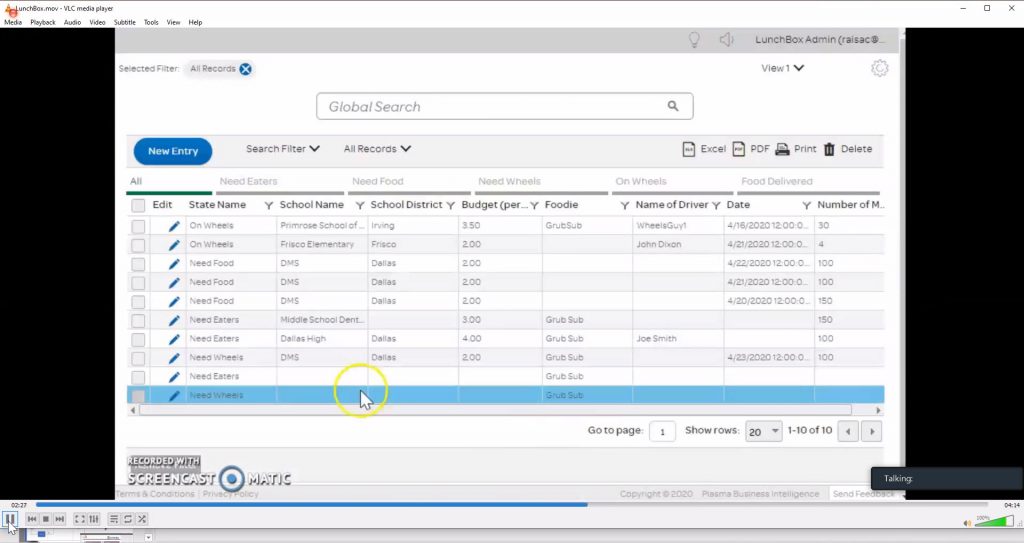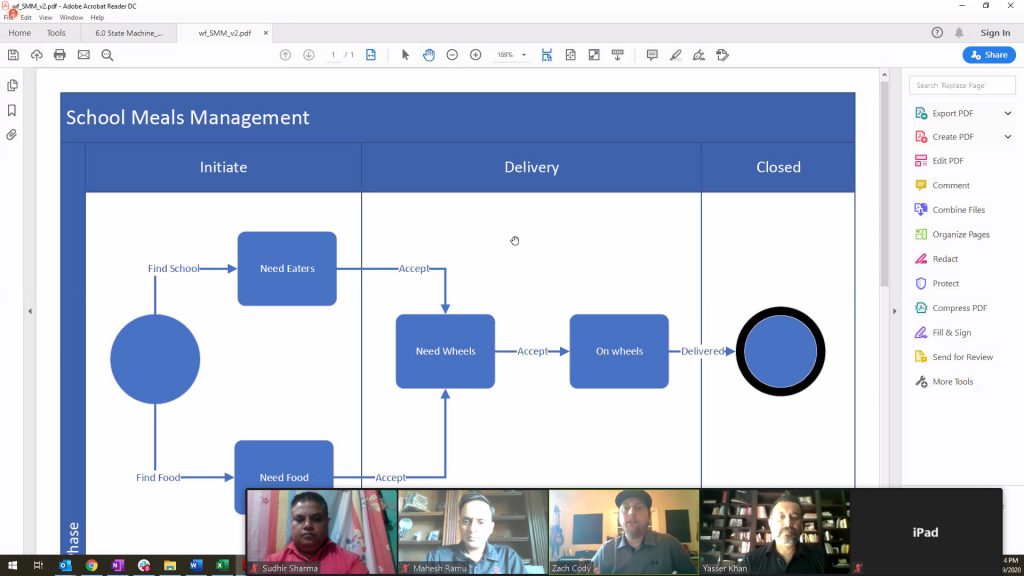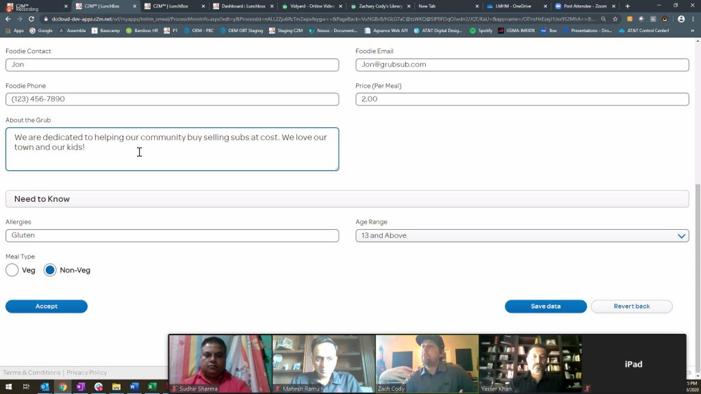 Our team is the “Lean Mean Hacking Machine” because we went lean on developers and engineers and heavy on Management and Sales expertise. The value available in C2M gave us the confidence to build as solution engineers, regardless of our departments: Projects – Zach Cody, Raisa Callistus, Ashna Gupta, Arun Kumar, Rich Greenwell and Sales – Maureen Krezmien. Day 1 of the hackathon we came together to discuss where we thought we could make a difference, and we decided to address the school lunch issues occurring due to COVID-19. There are many children suffering food shortages due to school shut downs, but there are also other local businesses such as restaurants that need help. After some solutioning, we thought our best idea would be to figure out a way to help both groups affected. It was our mission to use the C2M Workflow and Analytics platform to help bring struggling, local businesses together to feed the kids.